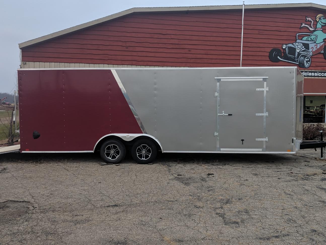 8.5' x 20' Plus 2' slant wedge, Ramp door, 48" side door, 24" tapered stone guard, 3500# brake axles, Radial tires, aluminum roof, Brite Nose, Flow threw vent, 4-D Rings, L.E.D. Lights, Interior light with switch, Spread Axle, Piano Hinge Side Door w/ RV Latch, Aluminum Wheels,